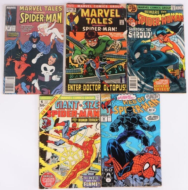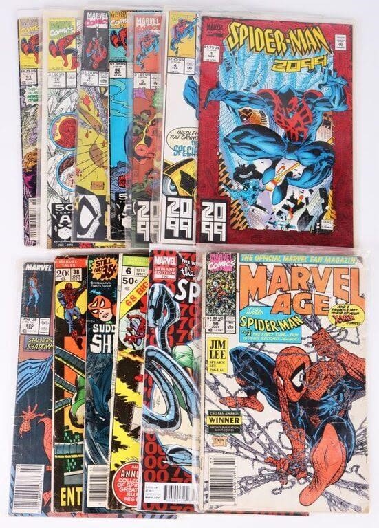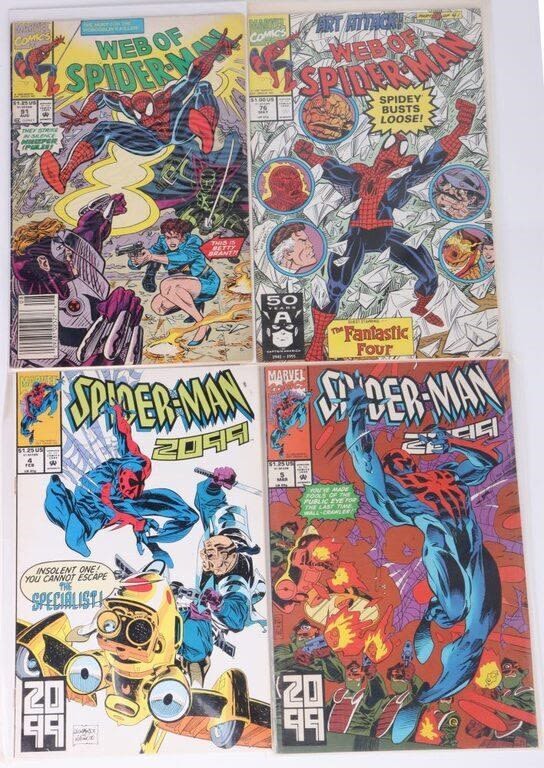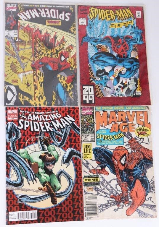 Spider-man collectible Marvel comics to include one Giant-Size Spider-Man #6, Marvel Tales #38 starring spider-man, Marvel Tales #220 Starring Spider-man, Marvel Age #90 Newsstand (Cover art by Todd McFarlane), Spider-Man 2099 #1 (1st appearance and origin of Spider-Man 2099), Spider-man 2099 #4, #5, Web of Spider-Man #82, Web of Spider-Man #76, Web of Spider-Man #91, Spider-Man Series “Torment” #3, and the Amazing Spider-Man #700 Variant Edition (Variant second printing cover art by Humberto Ramos