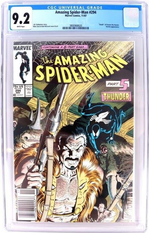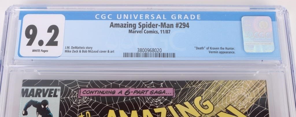 CGC 9.24 Amazing Spider-Man #294 – Death of Kraven. Includes: Kraven’s Last Hunt story arc part 5. Death of Kraven the Hunter, by self-inflicted gunshot wound.